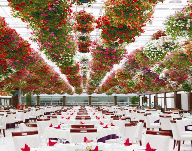 綠色生態(tài)餐廳中廳采用大型鋼結(jié)構(gòu)形式,跨度大,高度高、可植入高大樹木,設(shè)置亭臺(tái),造景時(shí)有更大的發(fā)揮空間,使景色更加逼真。中廳周圍設(shè)置其他配套連棟溫室,大部分餐飲設(shè)置于其中,降低大大的造價(jià)和后期維護(hù)費(fèi)用,同時(shí)保證了充足的活動(dòng)空間,美景美食交相輝映,相得益彰。